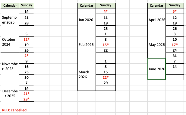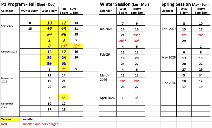Due to school gym unexpected maintenance during September and October, 2025, there are changes on training dates for Fall session. Details are shown in below.